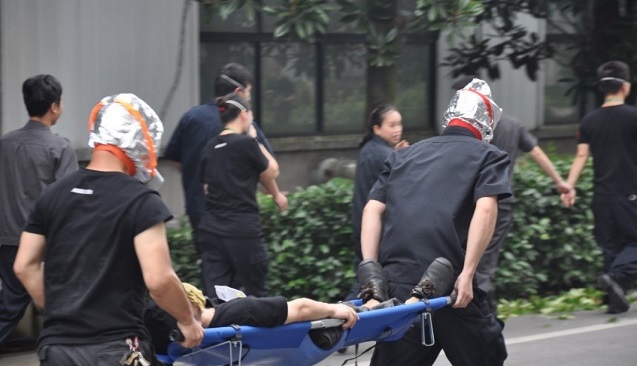 成立搜救小組對廠區內未及時逃離火災的“受傷受困”人員進行搜救,經過仔細尋找搜索,成功搜救出一名受困者,用擔架將其抬出,抬至安全集散地先進行初步“搶救”。目的是為了培養員工的搜救技能,以及安全意識。